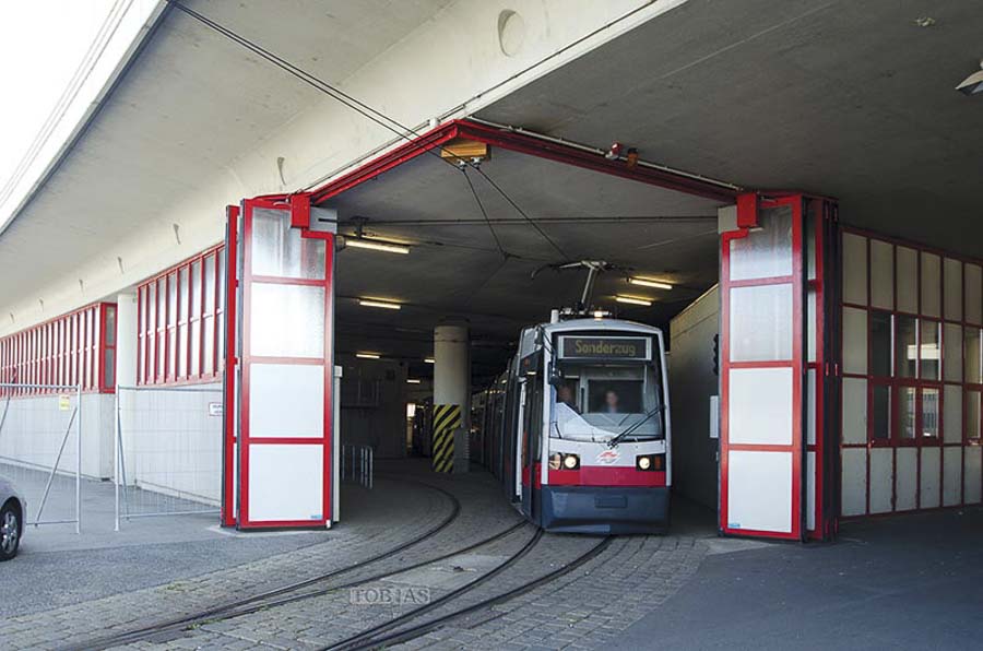 Ausgestattet mit Elektroantrieb werden sämtliche Bewegungskanten entsprechend der EN 13241-1 abgesichert. Sonderausführungen wie asymmetrische Teilung, 180°-Öffnung oder besondere Füllelemente sind ebenso wie der Einbau einer Gehtüre optional möglich.