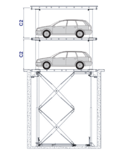 Unser Autoaufzug STORE-DOUBLE parkt zwei Autos übereinander. Der Lift wird von fünf Zylindern angetrieben, wodurch er ein Gewicht von 5000 kg mit einer Geschwindigkeit von ca. 6-8 cm pro Sekunde heben kann. Der maximale Hub des Autoliftes beträgt 4,5 m. Die Anlage ist mit einem Baldachin ausgestattet. Der Autoaufzug kann auf unterschiedliche Weise in Wohn- und Bürogebäuden eingesetzt werden. Die technischen Spezifikationen finden Sie im Datenblatt des STORE-DOUBLE.